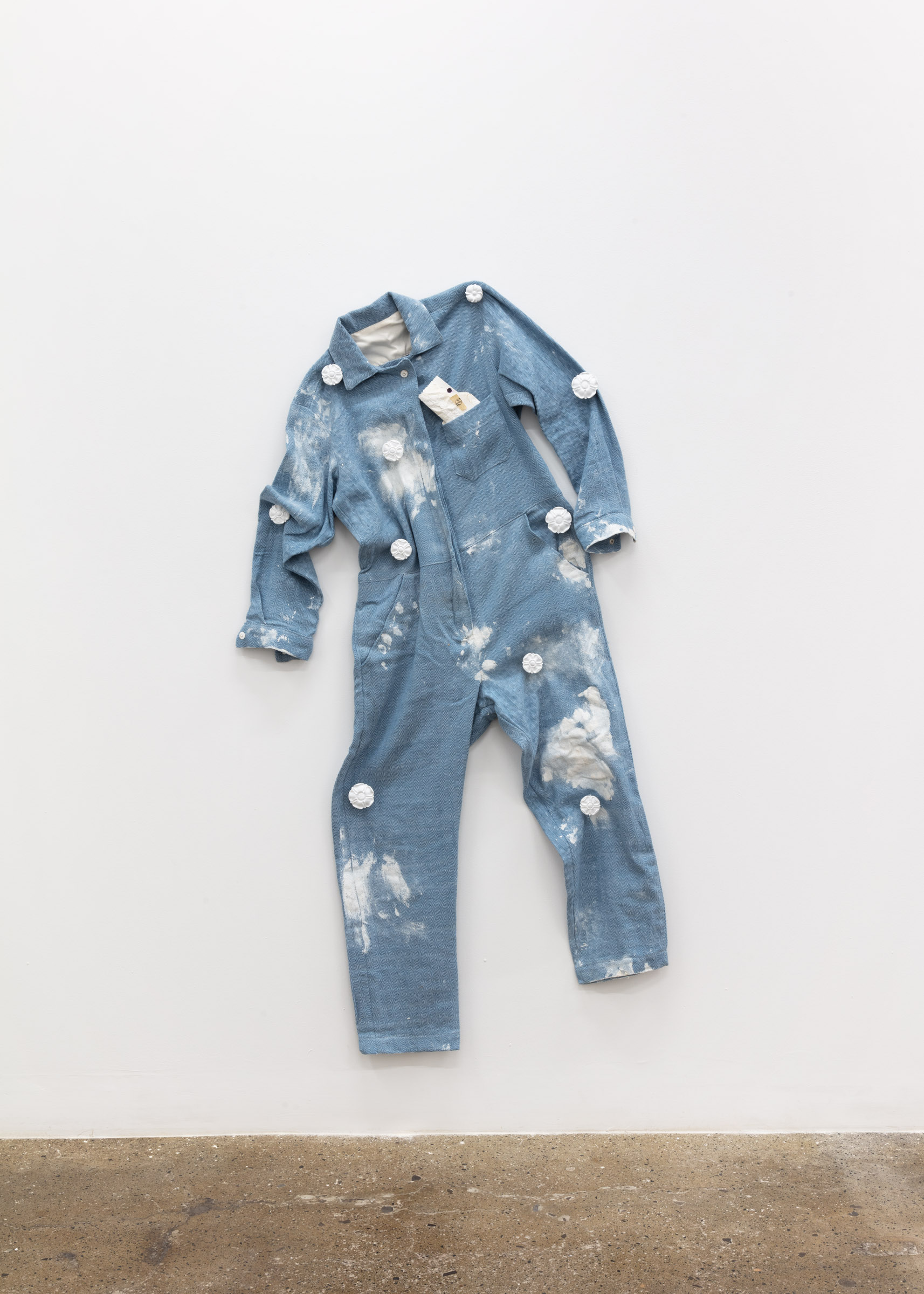 The two most recent works in Bury me are connected to Low’s interest in the weaver as an anonymous, unnamed figure in history. Clay suitcase (2023) is a reproduction of an existing boiler suit pinned to the wall. The textile is a handwoven cotton and silk produced through a specific matrix of how Low thinks about cloth as a weaver, one not often dedicated to contemporary work garments. The uniform is covered in patches of plaster and punctuated with rosettes. The posture of the uniform, one arm and leg slightly raised, calls to mind the motion of the plasterer at work and of Low’s effort to “work with tools the scale of my limbs.” [4] The final included work, Dream meadow (2023) is a striped orange and red skirt with a pocketed apron attached. Various handkerchiefs and papers printed with small insignia (wood louse, carpenter ants and mildew) hang from the pockets, presenting the viewer with a material-based fiction. Both artworks reference the body, evoking the absented presence of the weaver.