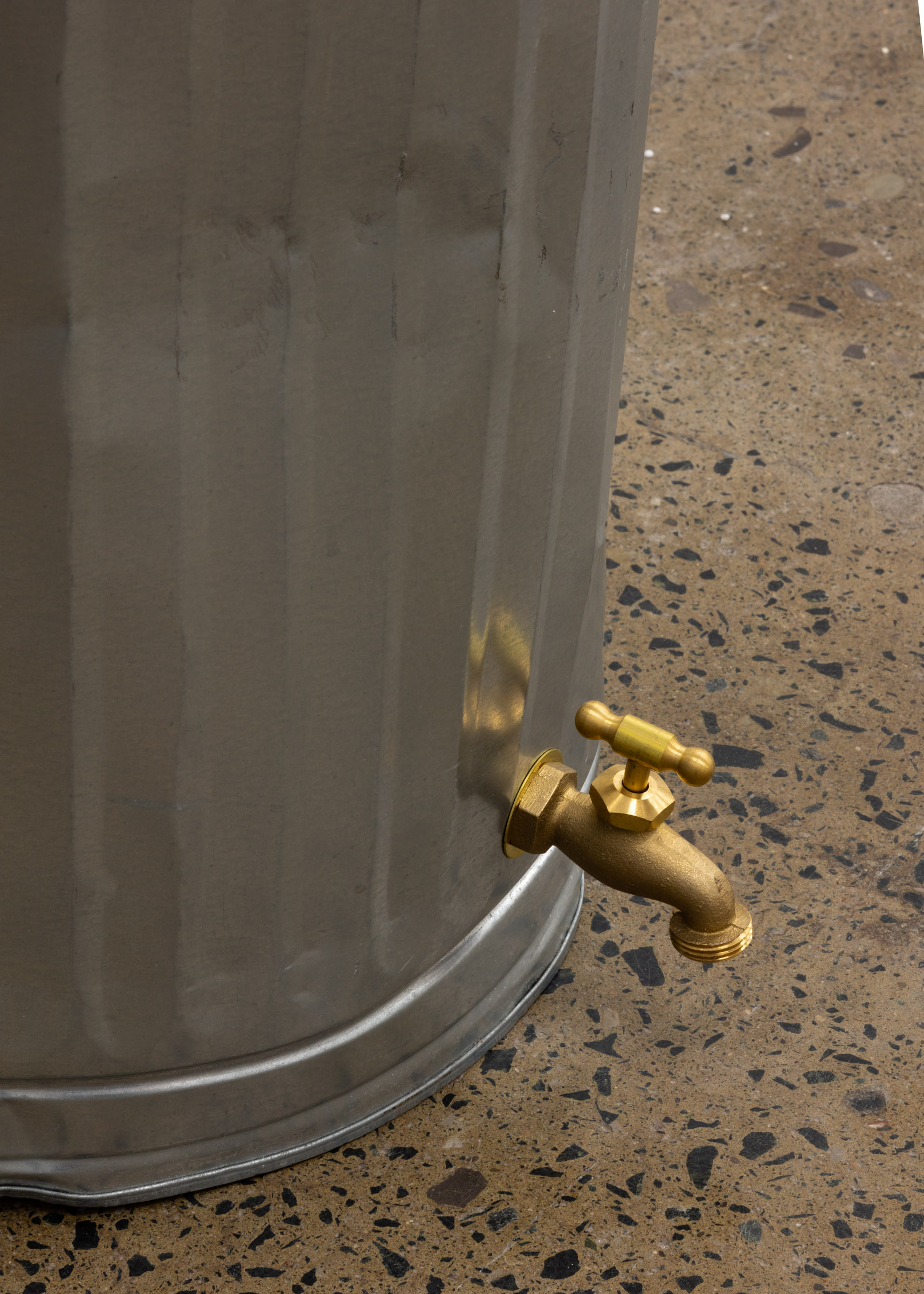 Where other exhibitions, like Chair for a woman (Contemporary Art Gallery, Vancouver, 2019), have cited the contents and atmosphere of period parlour rooms and domestic architecture, the works in Bury me concern themselves with the often invisible activities and skills related to specific forms of labour. Chamber-lye (2020) presents itself as a powder coated steel facsimile of a free-standing laundry sink. A coarsely woven rag with threads like enlarged pores and frayed edges hangs over the basin’s side. It is faintly stained pink, as if it had sopped up a spot of spilt cranberry juice many washes ago. Garbage dyer (2020) is an upright, dented garbage can with a faucet protruding just above its base. It is inset with a structure of welded steel sitting inside the open mouth of the can. Hung from the metal is a piece of handwoven and indigo dyed wool pierced by bent nails that hold the cloth in a spiral. Day Labor (2020) consists of an assemblage of three handwoven carpets rolled and nested with pieces of paper and wood moulding. The ties that hold the elements together suggests the action of organizing objects in one’s house for storage or for transport. In tension with the bundle, a small paper cup sits on the far end of the wood moulding. The cup is painted with strawberries that reference a printed cotton fabric from the American 19th century.