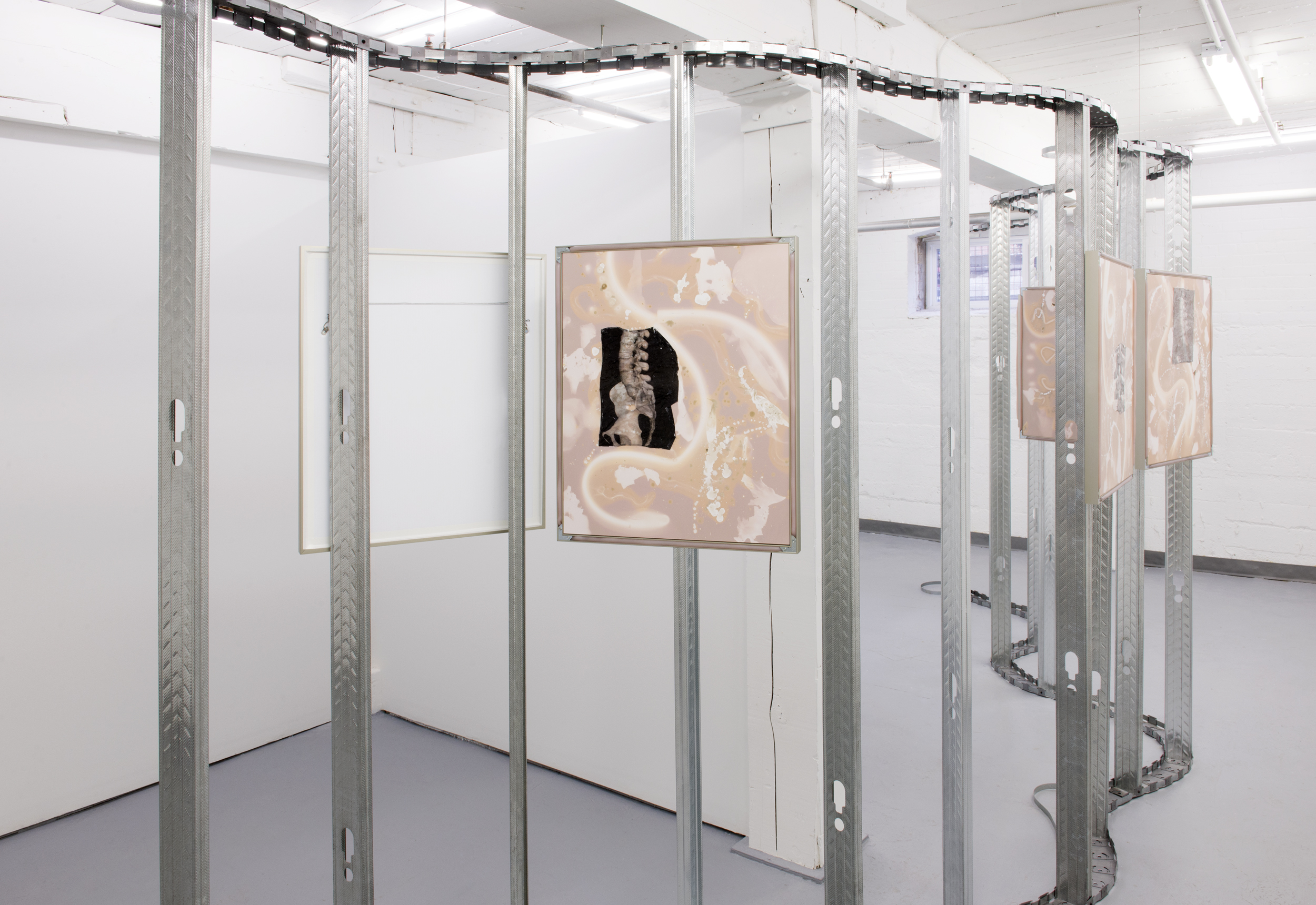 The logic of photography assumes controlled light will be used to expose an image on the surface of photographic paper. If it is created in a dark room, the image will be fixed a binary black and white. A castration of photography will prevent it from anchoring in this fixed, timeless certainty. In these backwards images is the betrayal of the spine by less rigid forms. Partially fixed photograms, generated in unbounded light, reveal fleshy pink tones. Here is debris from the studio--tubes, chemicals, orange rinds, silicone casts of eggs--full, ripe, messy and intuitively spread out. Combinations of steel and flesh, of sensuous textures and industrial shapes, surface in generative symbiosis. Openly exposed, they are left to develop in whatever way they will.