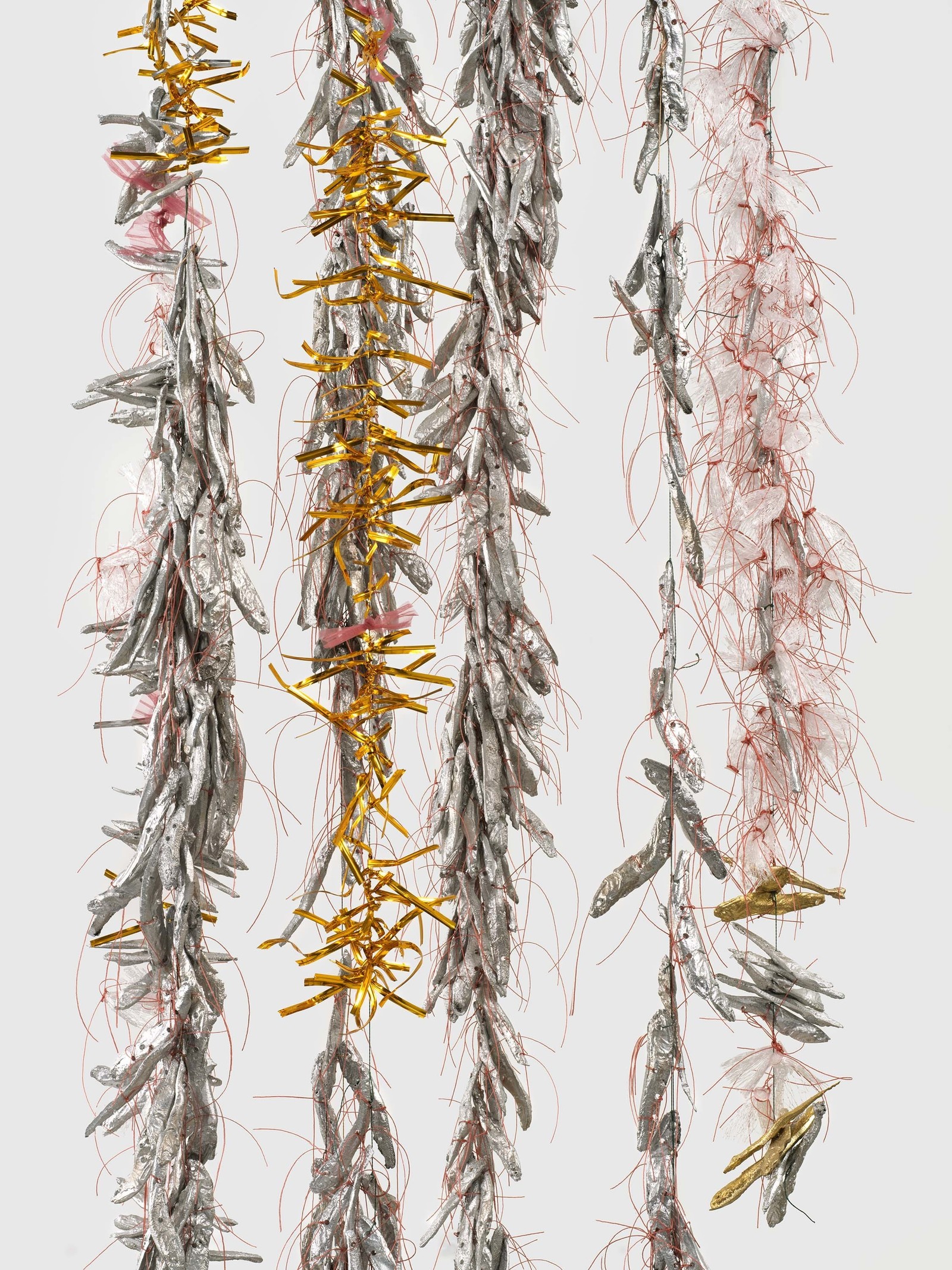 Autobiography of Death by Kim Hyesoon), thread, metallic twist ties, cast aluminum anchovy, cast bronze cabbage leaf, cast aluminum lotus tubers, plastic tangerines, tissue paper, spirits, 52 Walker, New York, US. Photo: Kerry McFate and Chase Barnes