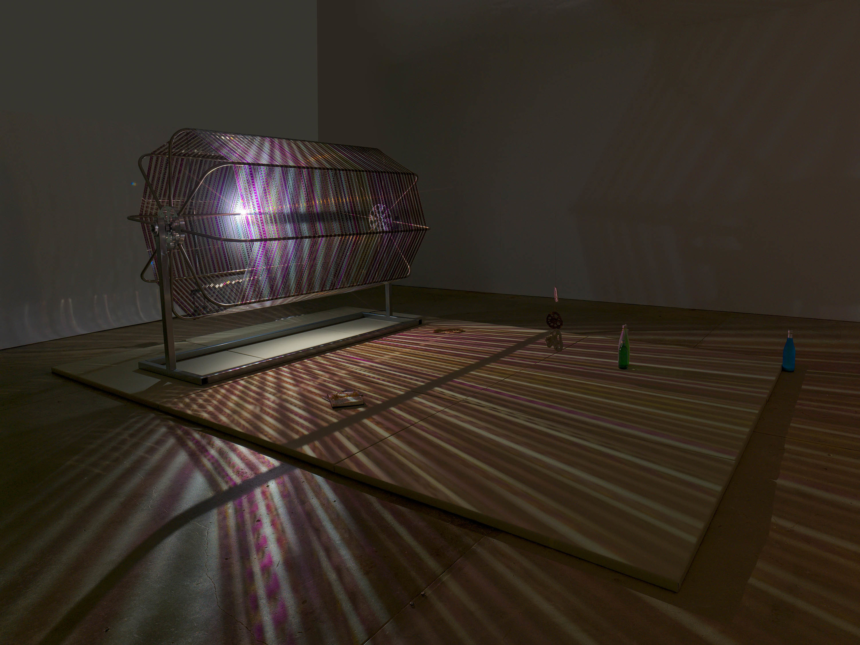 In Cascades, 2023-24, Super Joist, steel, tanned and unfixed film (continually sensitive), silicone, photographs from the series Fleshing Out the Ghost, cast-aluminum and bronze objects, sesame seeds, adzukibeans, polyethylene, paper, plastic tangerines, duck canvas, nylon, tatami mats, cast glass, hardware, and spherical magnets, dimensions variable. Photo: Sebastian Bach