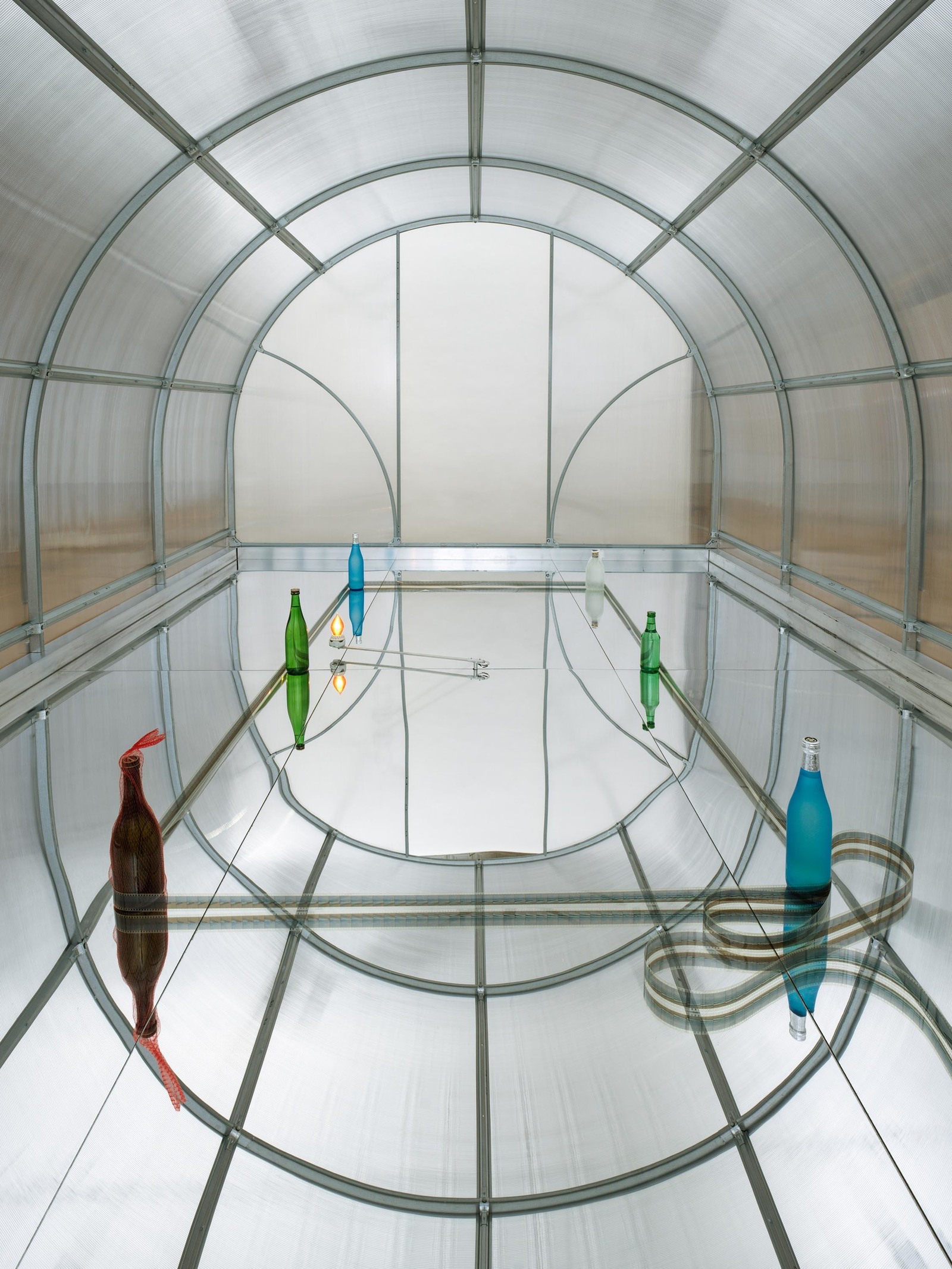 Receiver Transmitter (49 Echoes II), 2025, galvanized steel, polycarbonate, steel joists, aluminum tubing, plywood, hardware, stepper motor, controllers, battery, aluminum, stainless steel, mirrored plexiglass, ceramic fixture, light bulb, 35mm film, chiffon, metallic twist ties, nylon, and seven spirits. Photo: Kerry McFate and Chase Barnes