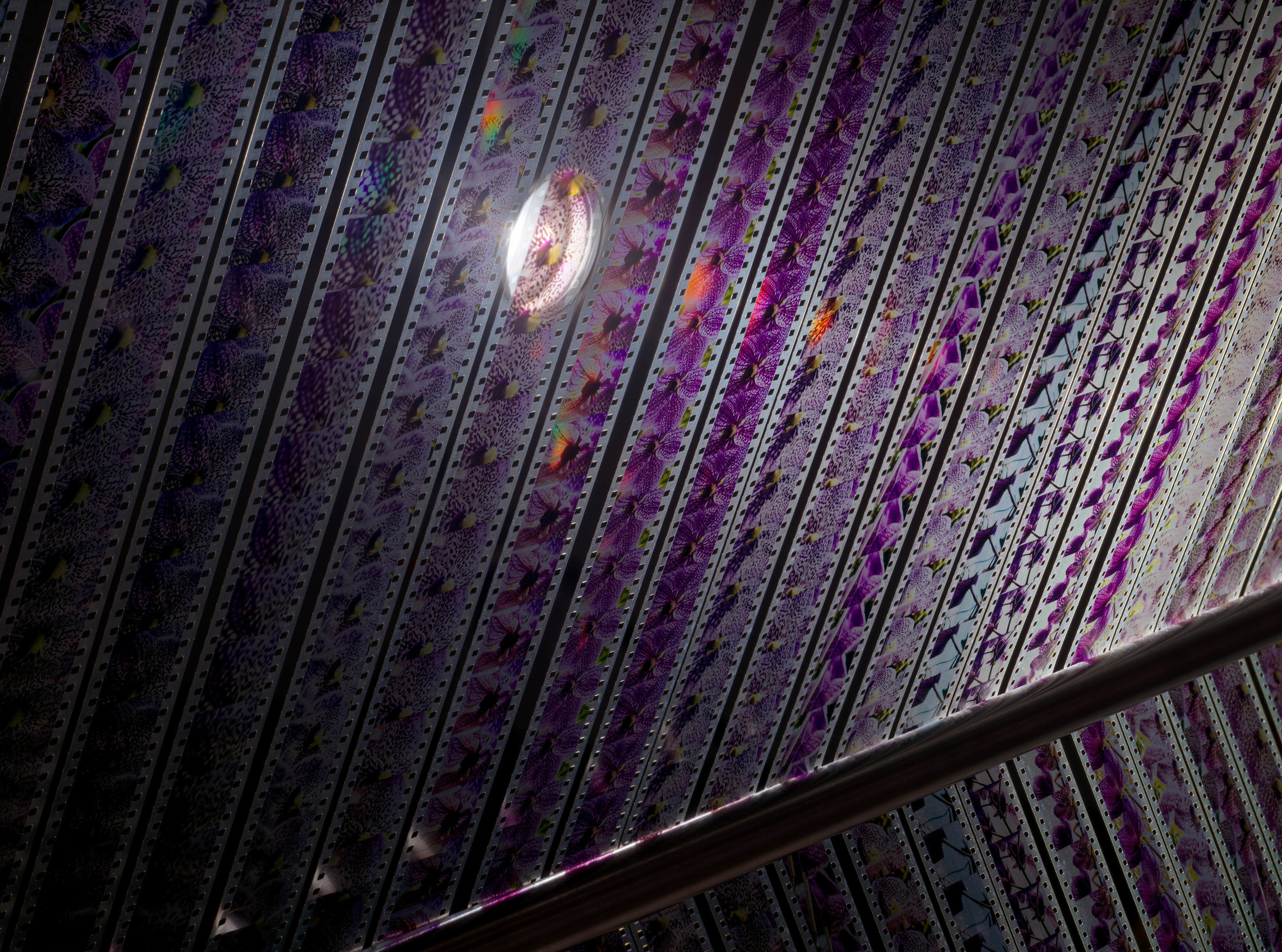 Great Shuttle, 2020-2021, Flex track, steel studs, airline cable, hardware, unfixed and continually sensitive film, photograms, spherical magnets, silicone, thread, cast aluminum anchovies, lotus root, perilla leaf, and cabbage leaf. Photo: Sebastian Bach