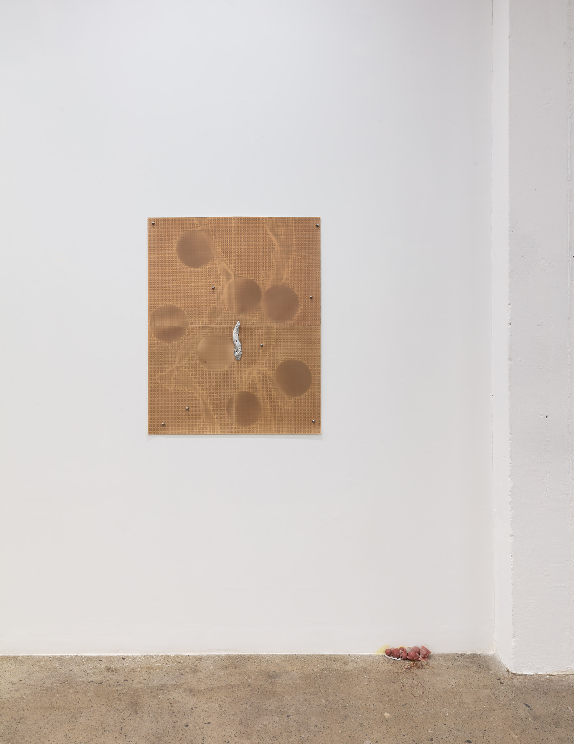 Before you is a presentation of works from Lotus L. Kang’s series Mesoderm. Being audience to Kang’s practice means a certain familiarity with the artist’s skillful creation of exhibitions that contain both artwork and the environment for that work’s presentation. I think first of the series of curving, spinal structures made of flex tracks and steel wall studs, collectively titled Membranes, ongoing since 2017. The forms act both as sculpture themselves, as well as architectural apparatus to present other works. Another work-as-apparatus that viewers may think of is Molt, wrought through Kang’s cohesive material repertoire. Molt consists of unfixed photographic paper and light-sensitive film skins where the gallery or studio itself is turned into what the artist calls a tanning machine. This body of work is often suspended from ceilings, dividing spaces and filtering light from windows, with recent iterations at Horizon Art Foundation in 2022 and the just-opened Atrium Project for MCA Chicago.