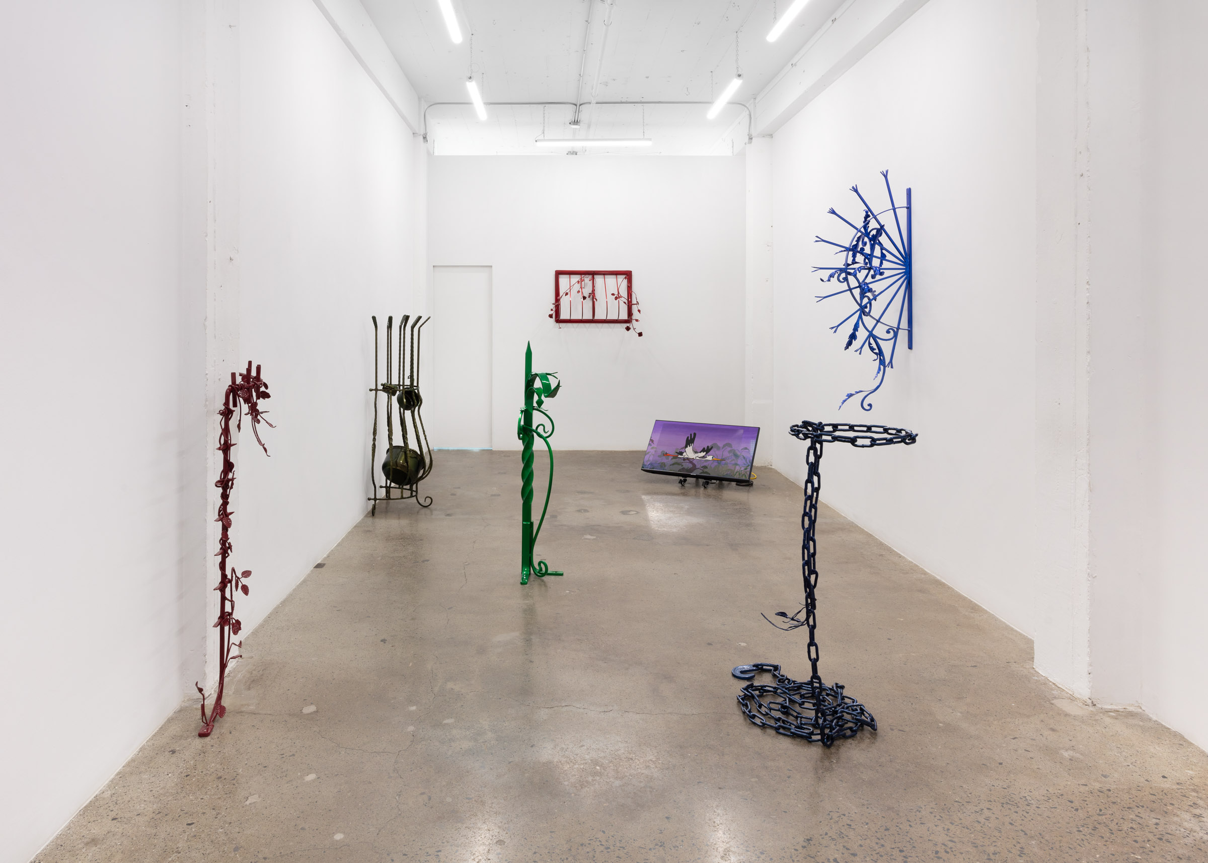 The sculptures in Not Here, Not There have an ominous quality, with defensive spikes, boils, and snares poised to protect property and ward off urinators. But they also have humour and romance to them, as red roses and vines have overgrown them, softening their harsh defences. Their charm is further avowed through their vibrant, powder-coated, pop colouring. In the artist’s words, the colours are meant to evoke an imaginary space (not unlike a green screen) — a surreal set or scene for animation. Playful, yet perverse, the sculptures contain a similar tension also found at the heart of the video.
