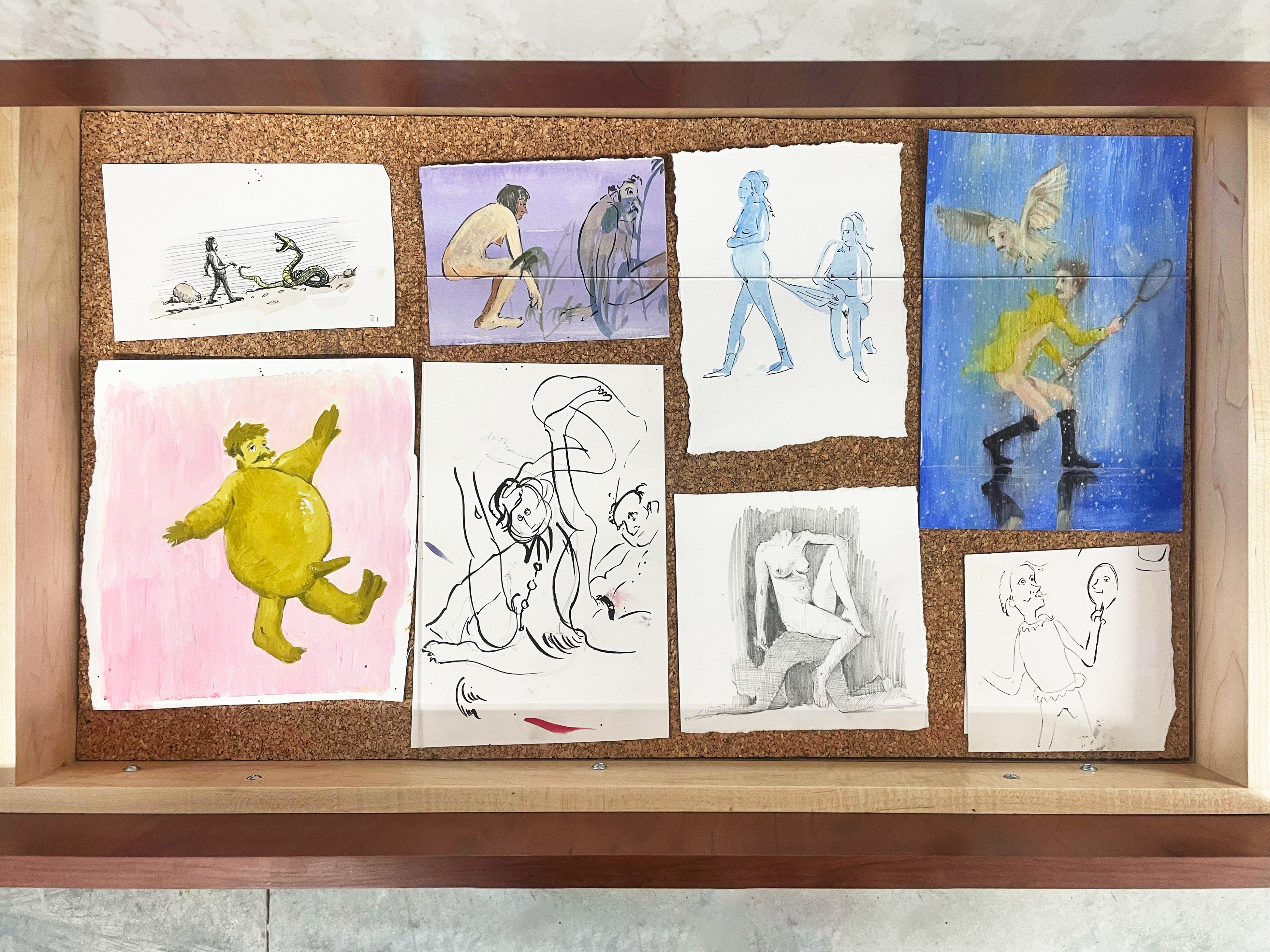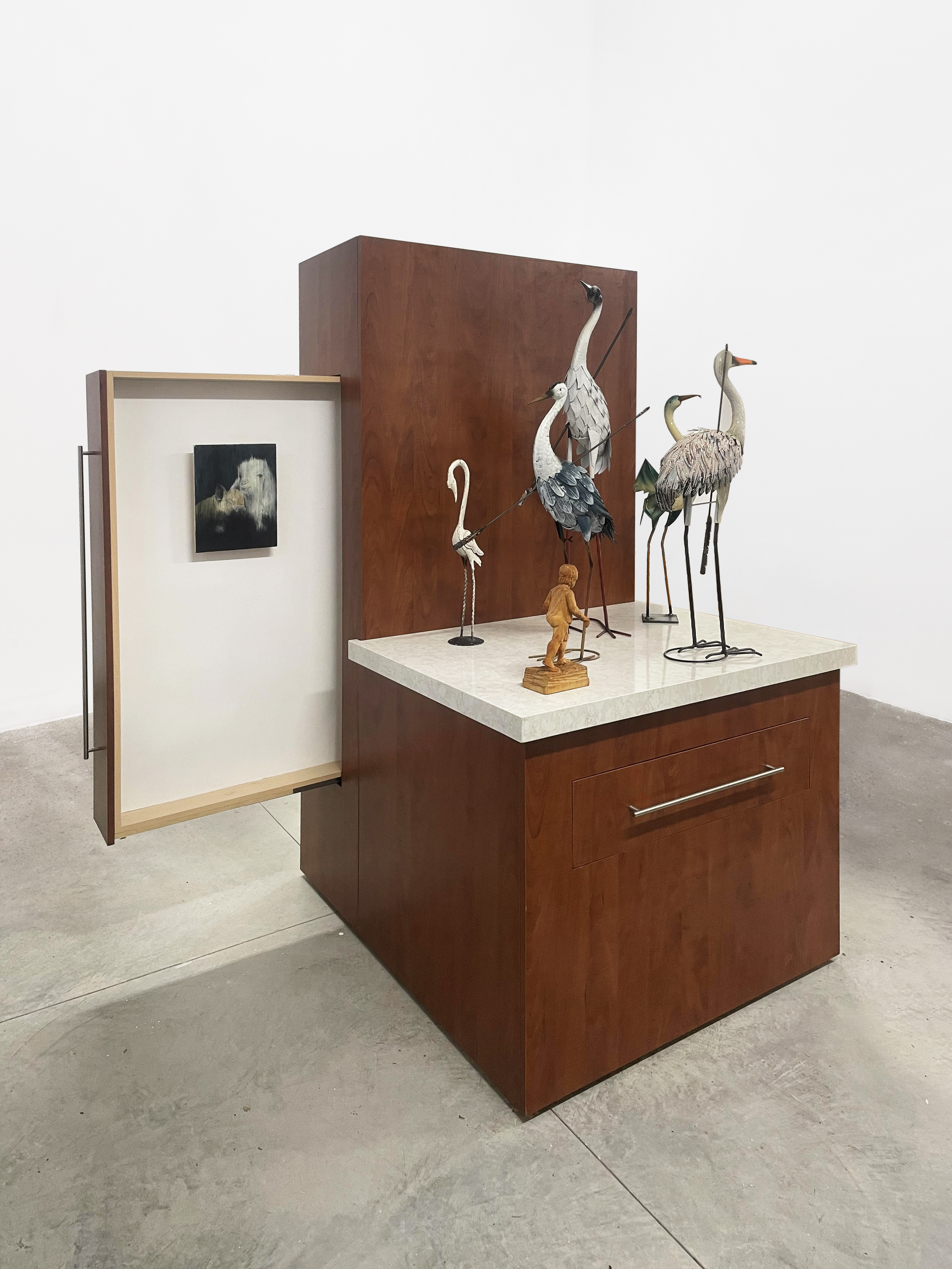 Tony Romano, Pigro’s Cabinet (detail), 2023. Laminated wood, granite; Inventory: 2 wood carvings, 1 ink painting on canvas, 1 oil painting on wood board, drawer full of ink and watercolour drawings on paper, 5 enamel painted metal birds, 75 x 46 x 46 in (190 x 116.8 x 116.8).