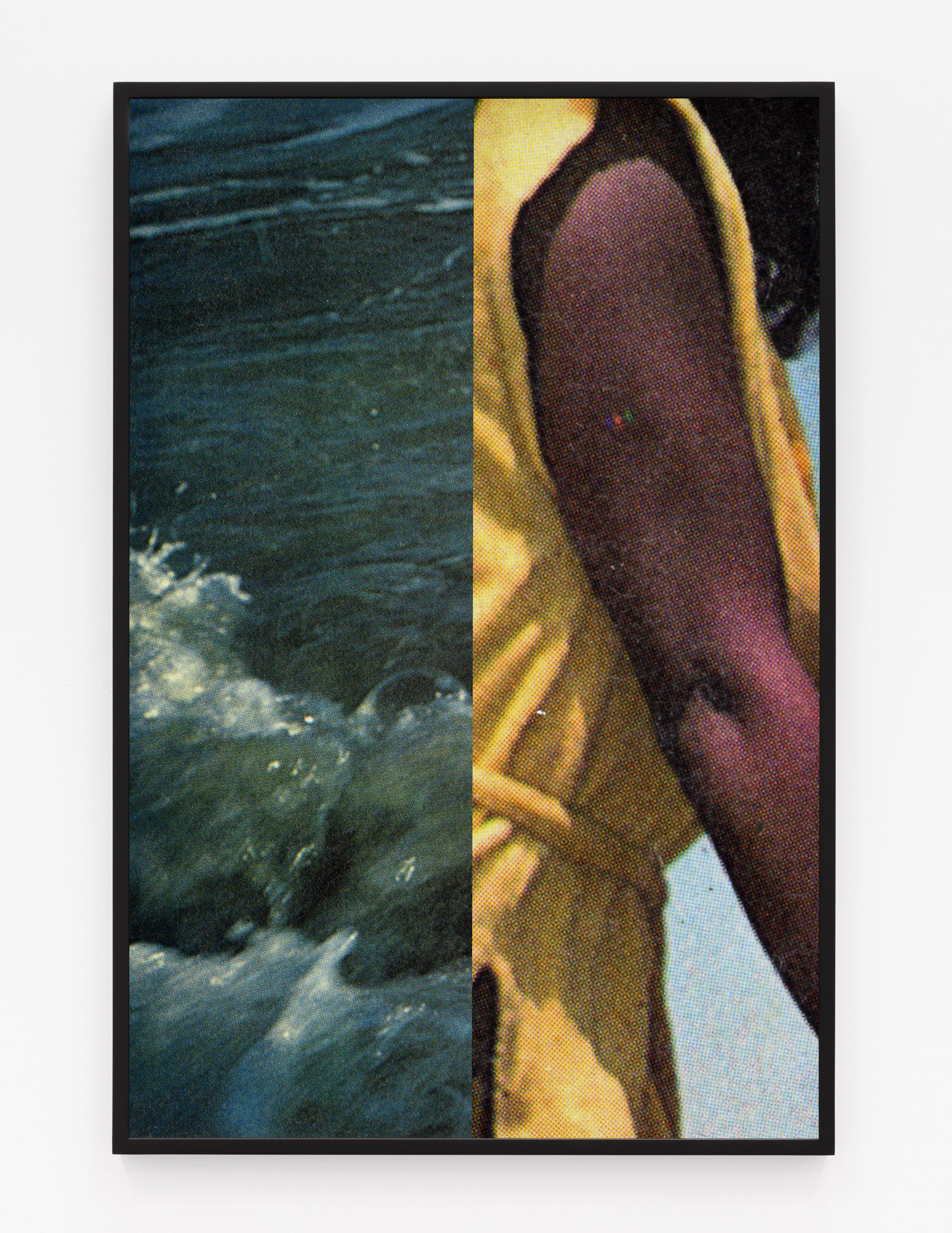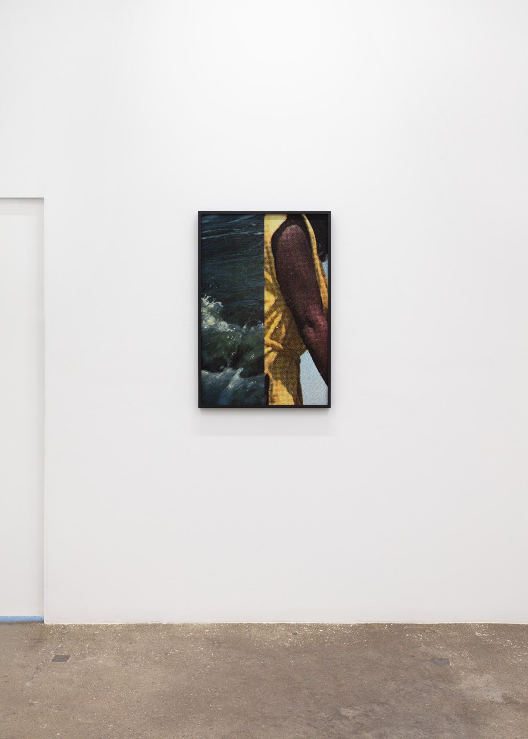 Formal readings of Mitchell’s diptychs and triptychs suggest an attentiveness to pleasure. Multiple images combined within a single frame featuring fragmentary shots of bodies whose bared Black skin is often posed to suggest an explicit sexuality — red fingernails adorn hands that enclose around a just out-of-sight crotch, buttressed on either side by images rushing water.